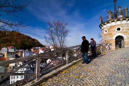 Karlovy Vary debe su nombre a su fundador, Carlos IV, que, según la leyenda, descubrió la fuente curativa a mediados del siglo XIV. Esta ciudad balneario es hoy en día afamada no sólo por sus fuentes milagrosas, de las que hay una docena en la propia ciudad, sino también por la naturaleza prodigiosa que la rodea, ya que está enclavada en un entorno de bosques de coníferas, cual si fuera una tarta de nata exuberante (acertada comparación con la que el célebre arquitecto suizo Le Corbusier expresó su admiración por esta ciudad que le entusiasmó). Se trata de un conjunto urbanístico en estilo historicista romántico, complementado por unas cuantas joyas modernistas: el origen de estos edificios responde a una época en que, en la intersección de los siglos XIX y XX, esta ciudad coqueta conoció su mayor florecimiento. Los tratamientos curativos consisten principalmente en beber agua de las fuentes, ricas en diversos minerales. También nosotros nos dirigiremos a las columnatas, donde manan las principales fuentes curativas, ¡sin olvidarnos de degustar sus aguas milagrosas!